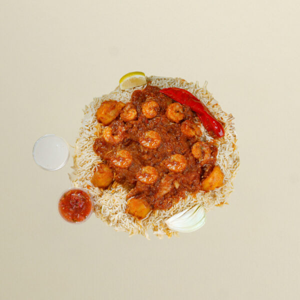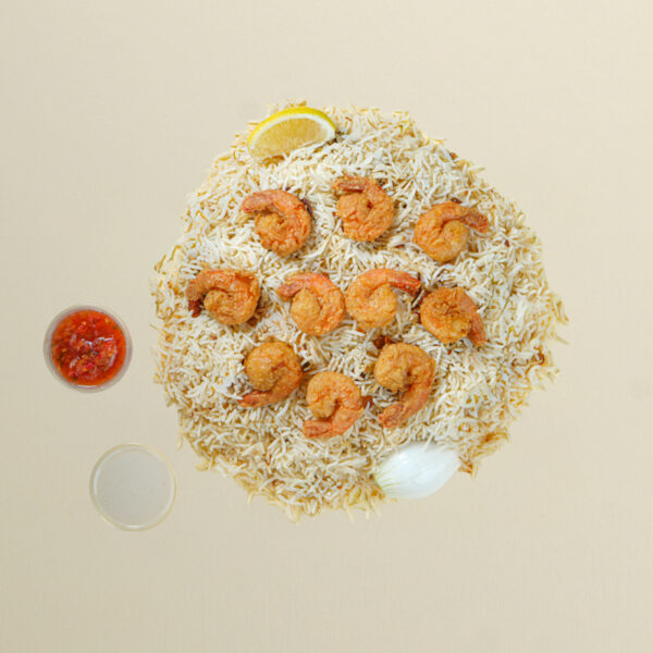 عشرة قطع من الروبيان بالصوص الخاص تقدم مع رز ابيض