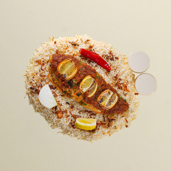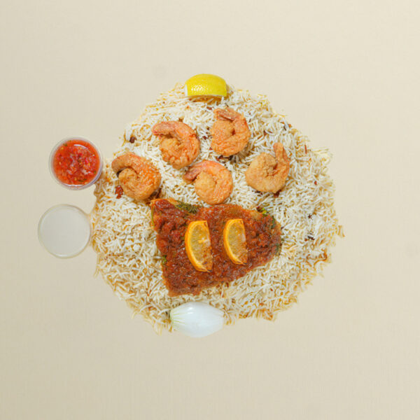 5قطع من الروبيان اللذيذ مع قطعة سمك بالفرن وقطعة سمك مقلي يقدم من الرز