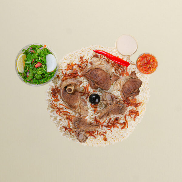 لحم تيس طازج مع رز بشاور 5 قطع مع سلطة جرجير وشطة حارة وطحينة